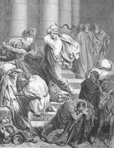 예수님께서 예루살렘에 입성하신 다음 행하신 첫 번째 행동은 성전을 정화하는 일이었다. 마태복음 21:12-17에서 예수님은 성전에서 매매하는 자들을 내쫓으시고, 돈 바꾸는 자들의 상을 엎으셨다. 그리고 "내 집은 기도하는 집이라 일컬음을 받으리라 하였거늘 너희는 강도의 소굴을 만드는도다"라고 말씀하셨다.