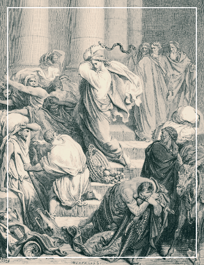 요한복음 2장의 이 사건은 예수님의 공생애 초기, 유월절을 앞두고 예루살렘 성전에서 일어났습니다. 성전 뜰 안에는 소, 양, 비둘기를 파는 상인들과 돈 바꾸는 자들이 자리를 잡고 있었습니다. 유월절 제사를 위해 많은 사람들이 지방에서 올라왔고, 제물을 준비하는 데 필요한 실용적인 수단으로 장사가 자리잡은 것입니다. 그러나 실용이 곧 신앙의 중심을 점령하게 되었을 때, 예수님은 분노하셨습니다.